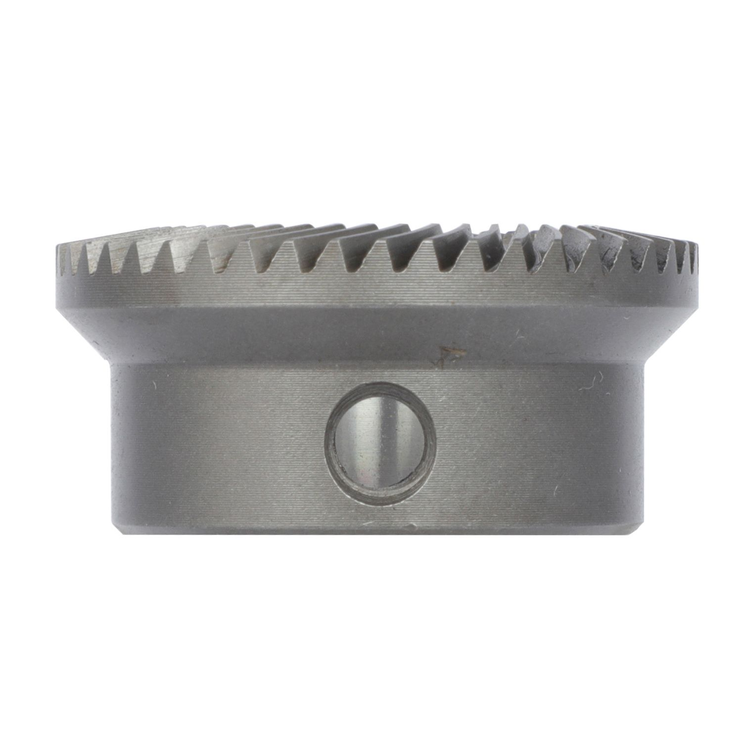 The gear teeth are helical, which results in smoother meshing, lower noise, and stronger load-bearing capacity compared to straight bevel gears.The center hole has a keyway for connecting to shaft components and transmitting torque; the set screw holes on the side are used for fixing and preventing the gear from slipping on the shaft.The entire structure is a single piece, and the tooth surfaces are precision ground to ensure meshing accuracy.