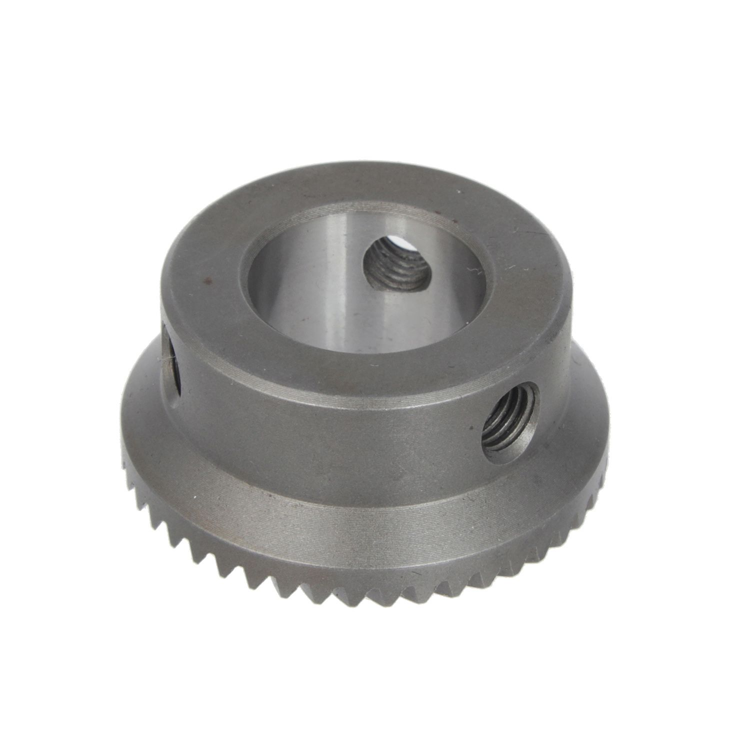 The gear teeth are helical, which results in smoother meshing, lower noise, and stronger load-bearing capacity compared to straight bevel gears.The center hole has a keyway for connecting to shaft components and transmitting torque; the set screw holes on the side are used for fixing and preventing the gear from slipping on the shaft.The entire structure is a single piece, and the tooth surfaces are precision ground to ensure meshing accuracy.